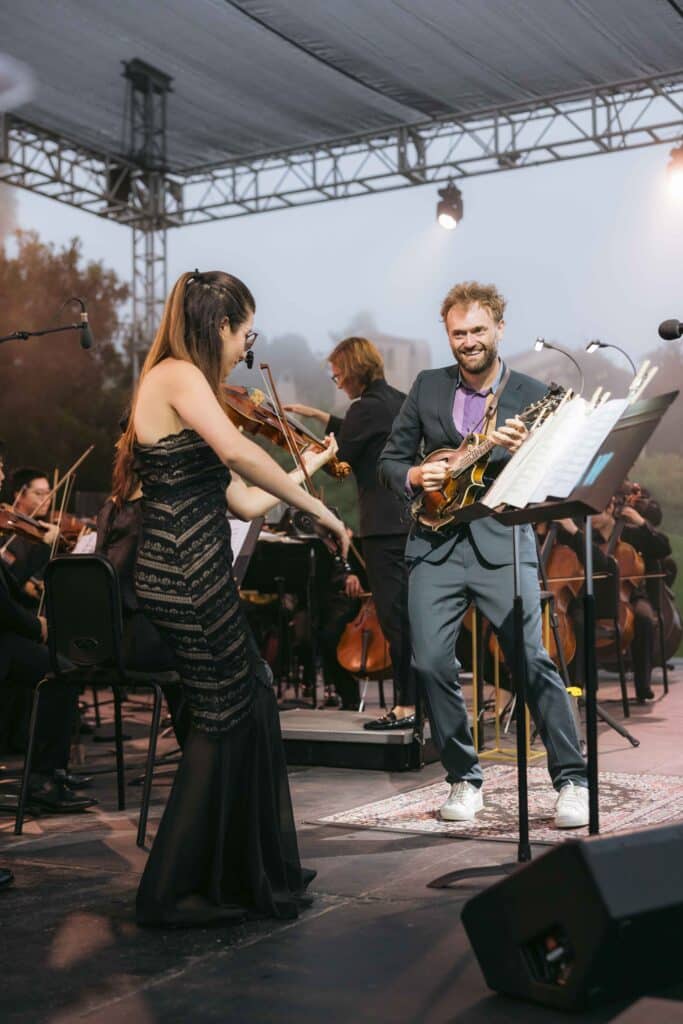 Gala guests enjoyed panoramic views of the coastline, signature cocktails, and a gourmet al fresco dinner curated by the Montecito Club, followed by dessert alongside Music Academy teaching artists. The musical centerpiece of the evening featured Grammy Award-winning mandolinist and MacArthur “Genius” Grant recipient Chris Thile, performing alongside the Academy Gala Orchestra led by Daniela Candillari, with a guest appearance by the Sing! children’s choir. The concert offered a genre-defying journey from Bach to Bluegrass, highlighting the boundless versatility of Thile’s artistry. The evening’s program featured a vibrant mix of classical and contemporary works, including a selection from Bach’s Concerto for Two Violins, Caroline Shaw’s evocative And So, and Julep and My Oh My by the Punch Brothers — featuring Chris Thile on mandolin and a special appearance by the Music Academy’s Sing! children’s choir.